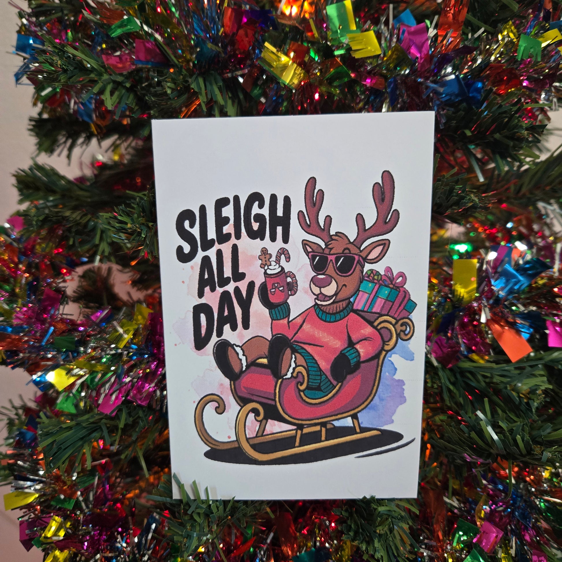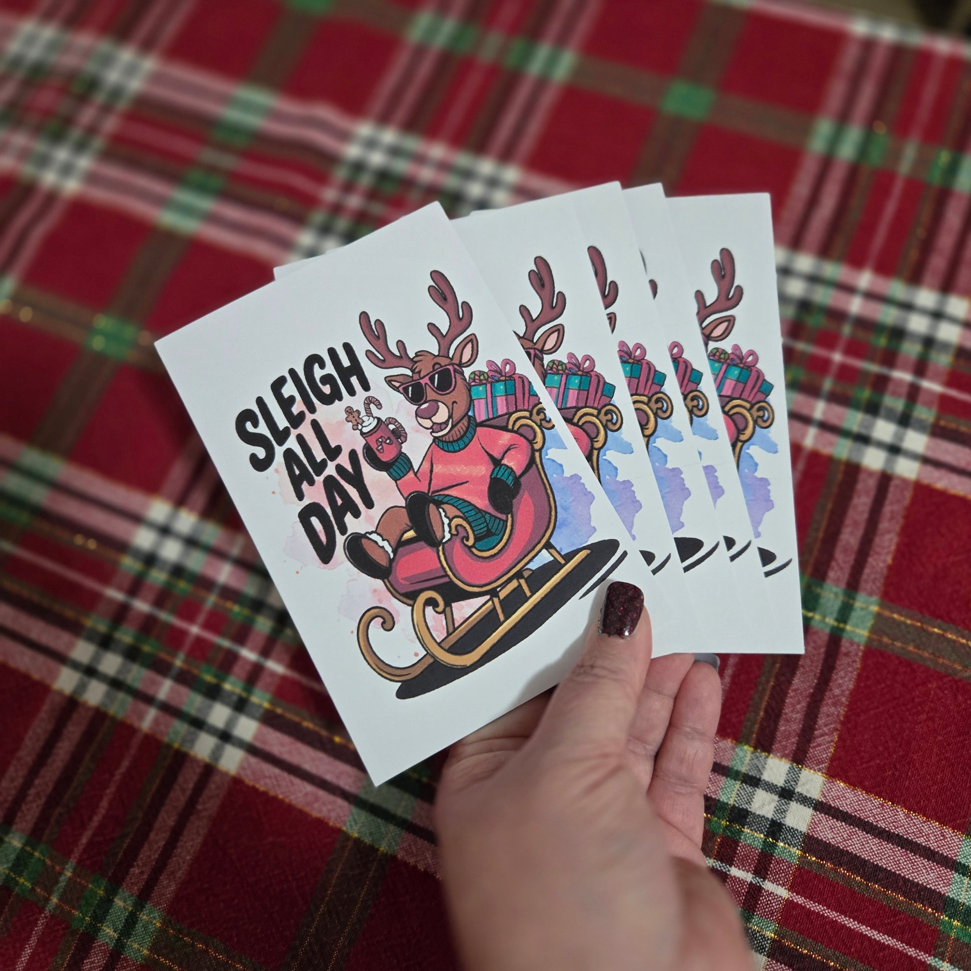 5-Pack Reindeer Sleigh All Day Christmas Cards – 4x6 with Envelopes & Stickers