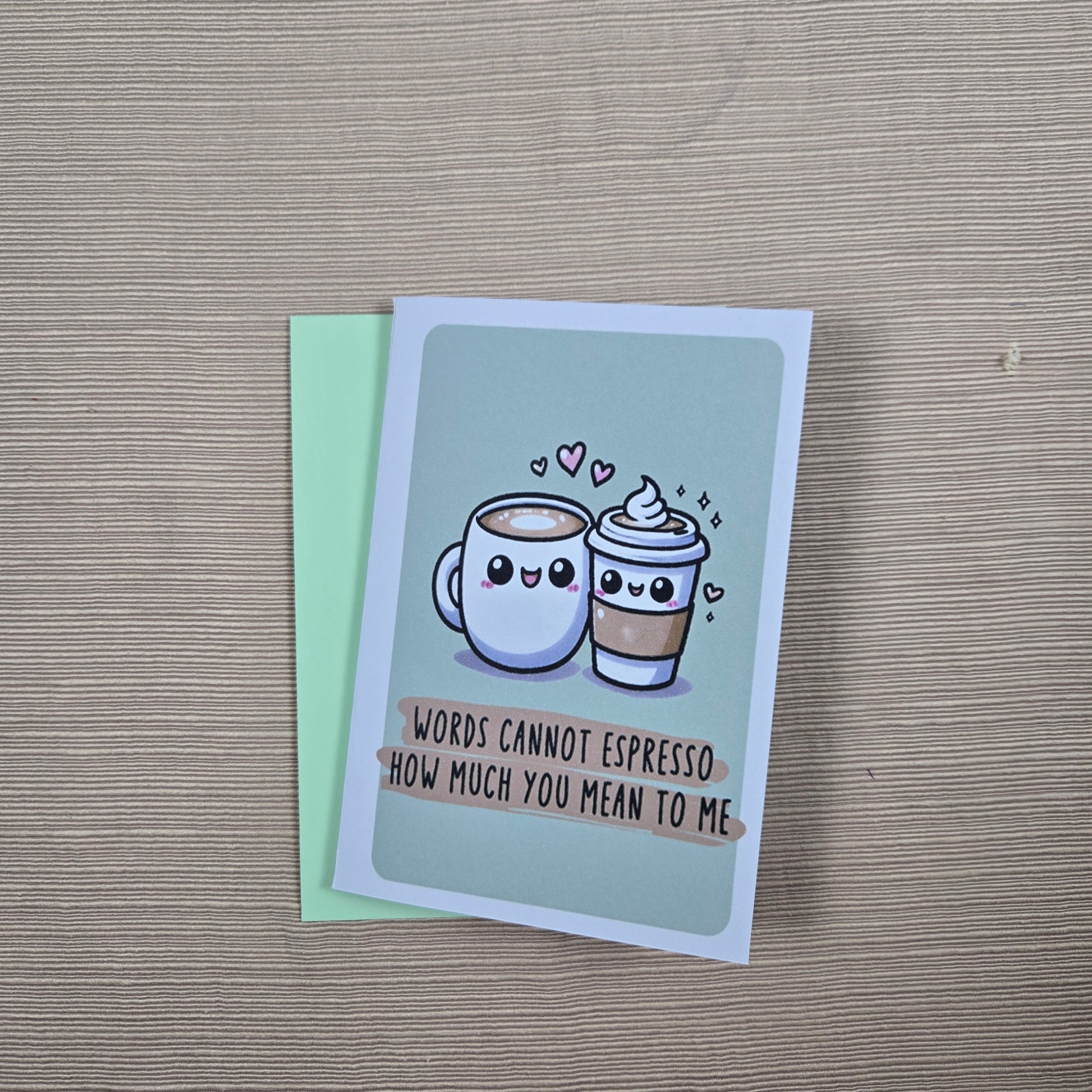 Celebrate love every day with the 5x7 Cute Espresso Love You Card, perfect for anniversaries, Valentine’s Day, or simply letting someone special know how much they mean to you. Featuring an adorable espresso-themed design and a sweet message already included, this card blends playful charm with heartfelt sentiment. Paired with a light green envelope that adds a fresh and cheerful touch, it’s ready to send or gift at a moment’s notice. Ideal for coffee lovers and romantics alike, this card makes every occasion a little more delightful and filled with love.