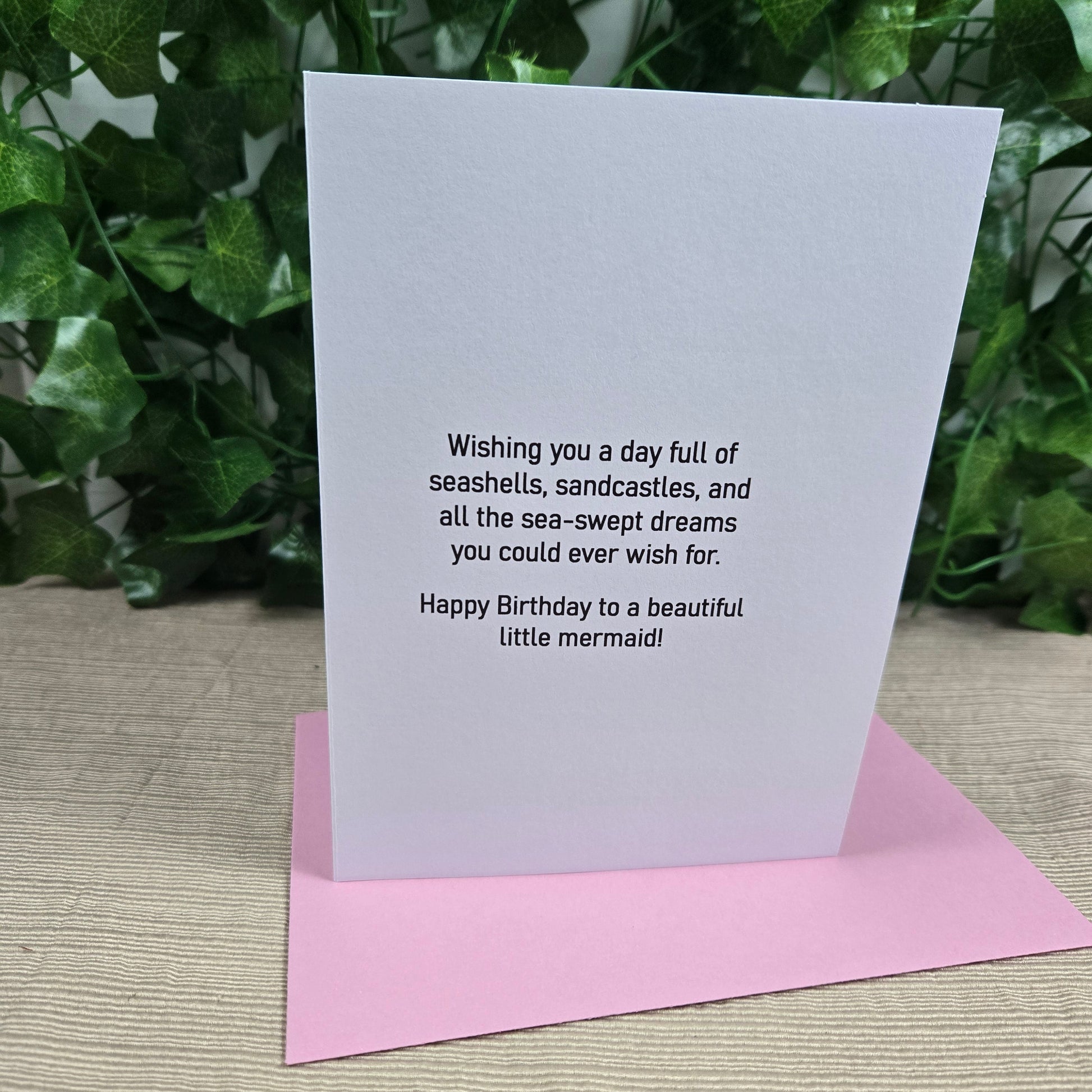 Inside message: "Wishing you a day full of seashells, sandcastles, and all the sea-swept dreams you could ever wish for. Happy Birthday to a beautiful little mermaid!"
