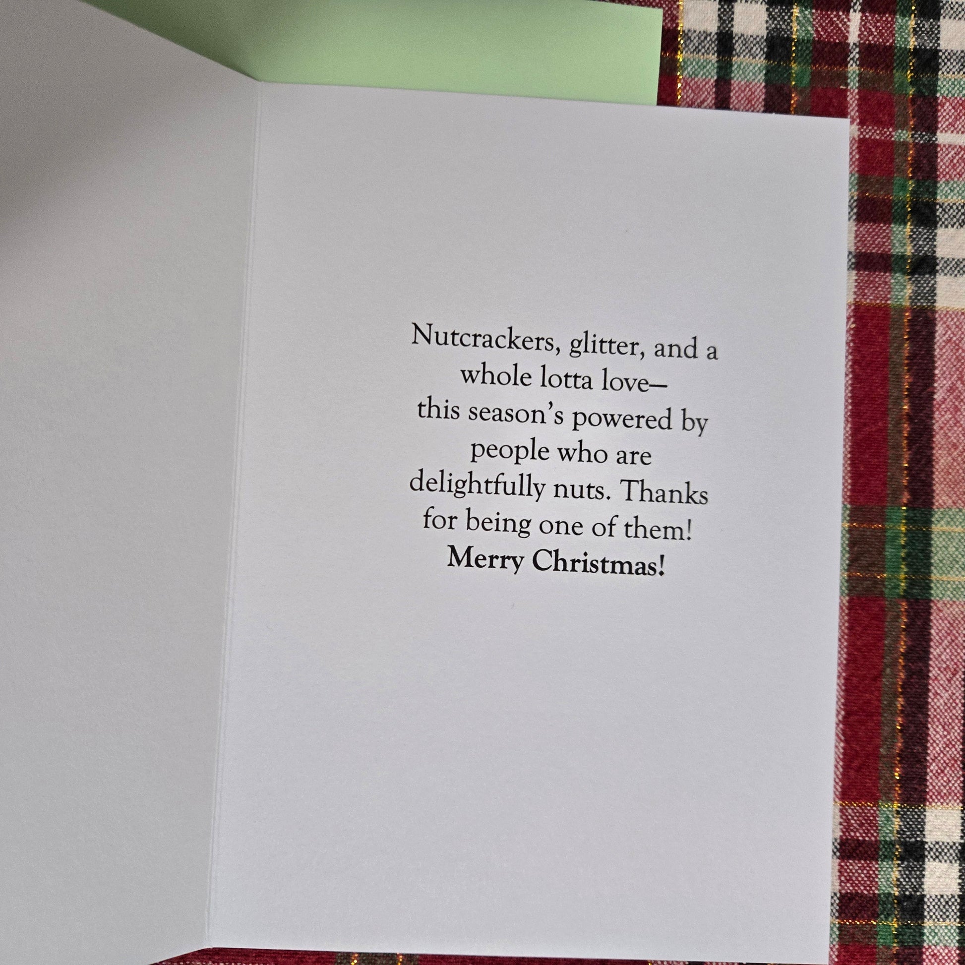Inside message: "Nutcrackers, glitter and a whole lotta love- this season's powered by people who are delightfully nuts. Thanks for being one of them! Merry Christmas!"